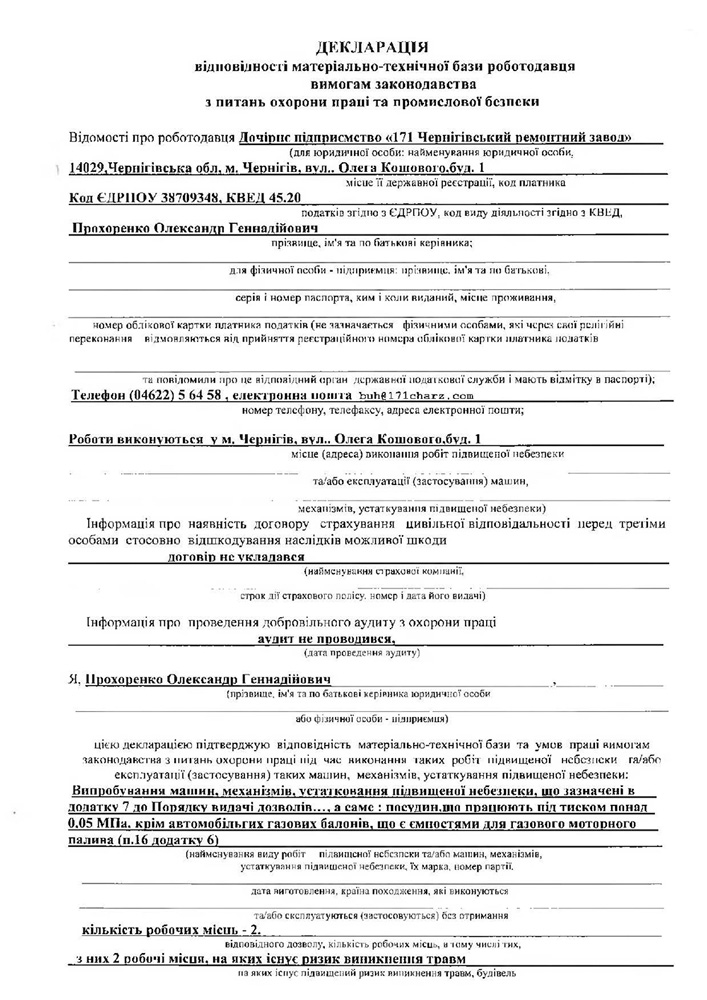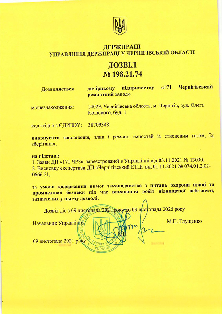 Дочірнє підприємство «171 Чернігівський ремонтний завод» пропонує послуги з технічного обслуговування, ремонту технічного стану, капітального ремонту транспортних цистерн СГУ-7КМ, ТРЖК-8, ТРЖК-3, ТРЖК-2У, ЦТК та інших. І послуги з огляду на балони високого тиску до 600 Атм.